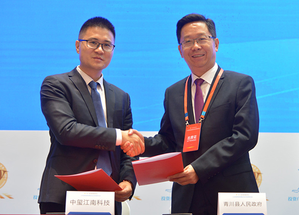 青川县委副书记、县长刘自强代表青川县与浙江湖州中玺江南科技公司进行展示签约,签订年产600台电梯生产线项目,总投资2亿元。县委常委、统战部部长范正勇,副县长罗超,县投资促进局、县经信局等相关部门负责人分别与深圳开普蓝生能源环保公司、四川泰丰建设公司、四川蜀道地中药材公司、四川青源林农产品开发公司、浙江中哲新材料公司、西南建材设备制造公司进行集中签约6个项目。